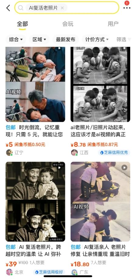 近期,AI星球岛发现在小红书、抖音、视频号等视频平台上,使用AI技术“复活”老照片中的亲人玩法非常火爆。并且已经有人在闲鱼上推出了从几块到几十不等的AI“复活”老照片的视频定制服务。