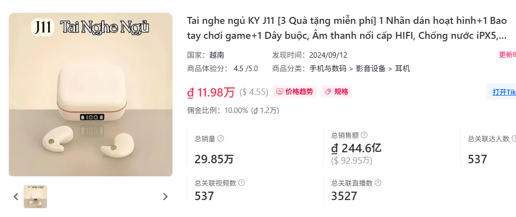 在TikTok Shop越南站,中国品牌KJ的一款睡眠耳机周期内(6.16-7.16)销量暴涨386,638.03%,7月13日销量高达27.45万单,一跃登顶商品热销周榜。