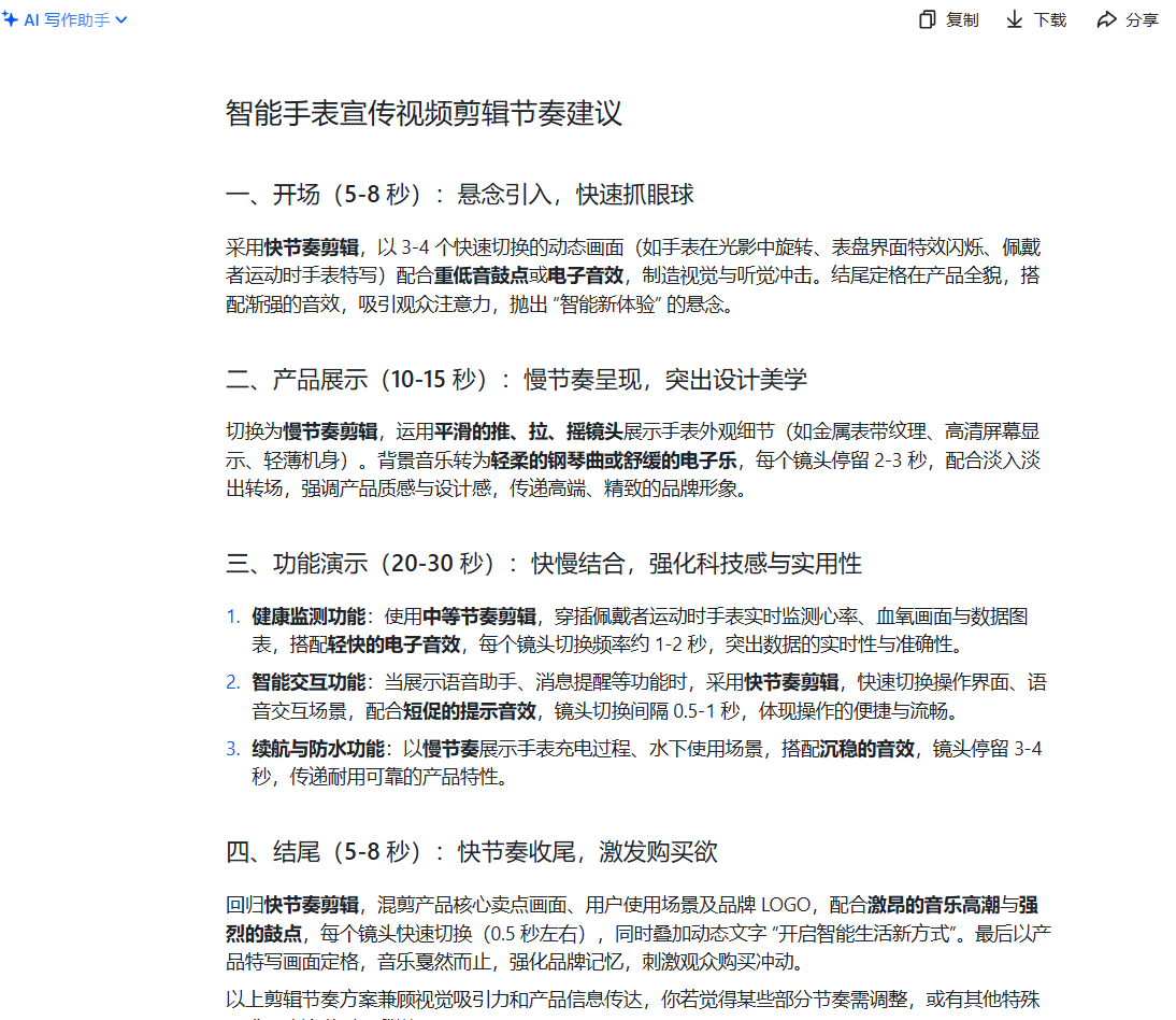 在豆包的输入框中,输入明确的创作指令。例如 “为一款智能手表设计宣传视频,推荐适合的背景音乐和画面素材”。借助豆包的内容生成能力,获取完整的视频脚本、合适的素材推荐以及拍摄思路,搭建视频创作的基础内容。