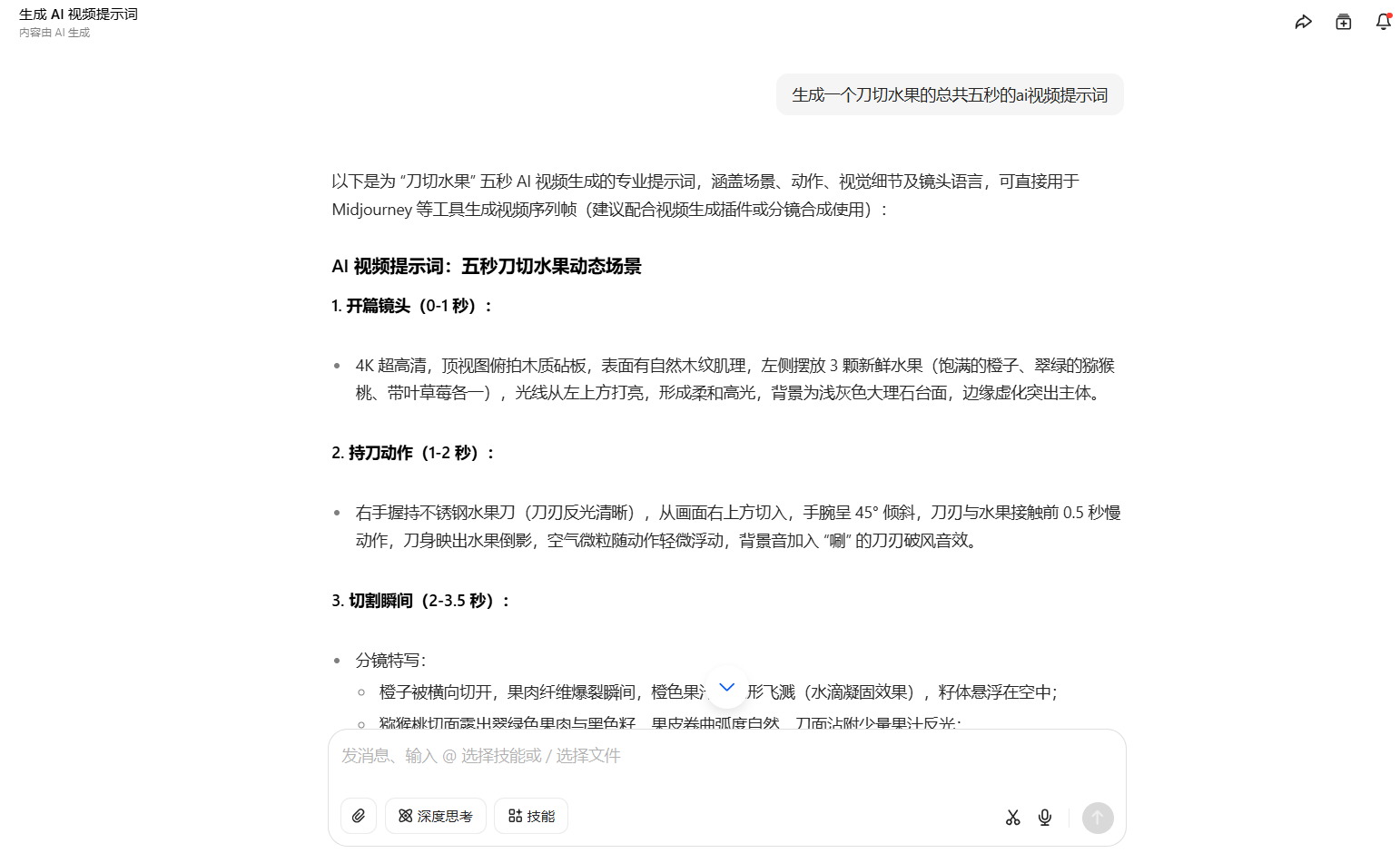 在豆包的输入框中,输入详细的动画创作需求指令。例如 “生成一个刀切水果的视频提示词”。利用豆包强大的内容生成能力,得到动画的故事脚本、角色设定、文案台词等基础内容,用明确的指令生成动画创作的核心素材。