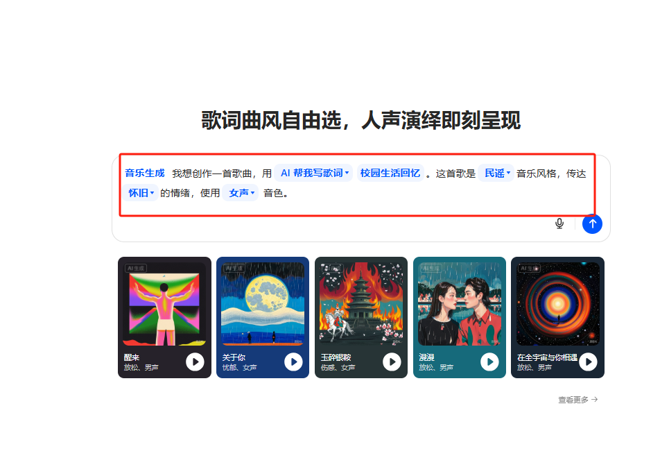 按照固定句式 “我想创作一首歌曲,用AI帮我写歌词 [描述歌词要表达的主题]。这首歌是 [描述风格] 音乐风格,传达 [描述快乐、悲伤、兴奋等] 的情绪,使用 [可选择男声或者女声] 音色”,在输入框中准确填写你的创作需求。例如 “我想创作一首歌曲,用AI帮我写歌词关于校园生活回忆。这首歌是民谣音乐风格,传达怀旧的情绪,使用女声音色” 。
