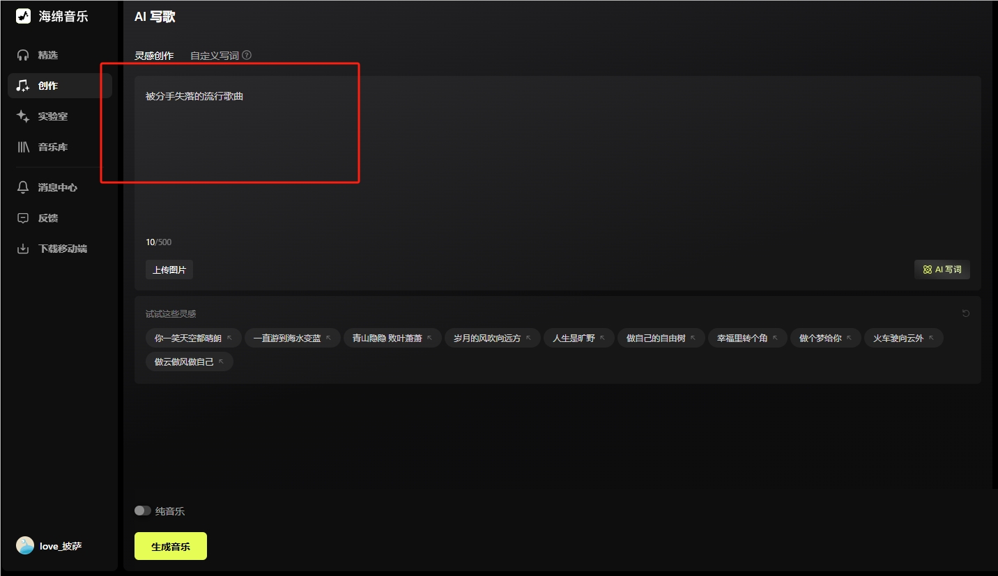 进入工作台,点击“创作”,选择“灵感创作”类型,在编辑框中输入提示词。比如以创作流行歌曲为示例,输入指令“被分手失落的流行歌曲”。