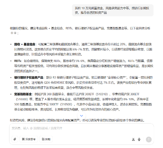 在豆包的输入框中,准确输入投资问题和需求,例如 “我有 10 万元闲置资金,风险承受能力中等,想进行长期投资,推荐合适的投资产品”“帮我分析当前股票投资组合的风险,并给出优化建议” 。通过明确的指令,让豆包生成符合个人情况的投资建议内容。