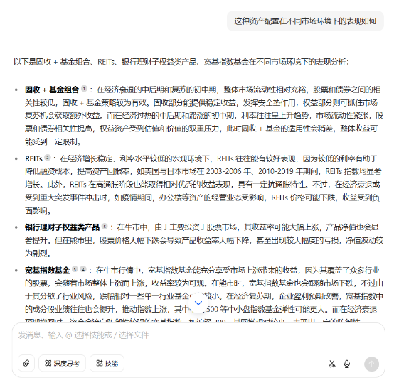 豆包会基于输入信息,结合市场情况和金融知识,返回投资建议。仔细阅读建议内容,若对某些投资产品、策略存在疑问,或者希望进一步了解相关信息,可进一步追问,如 “详细解释下该基金的投资策略”“这种资产配置在不同市场环境下的表现如何”,引导豆包生成更深入、更全面的解答。