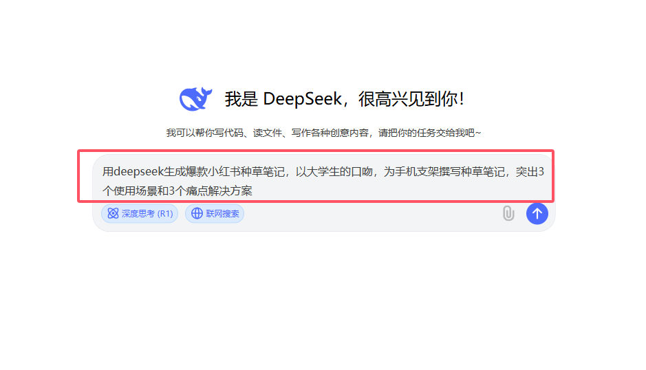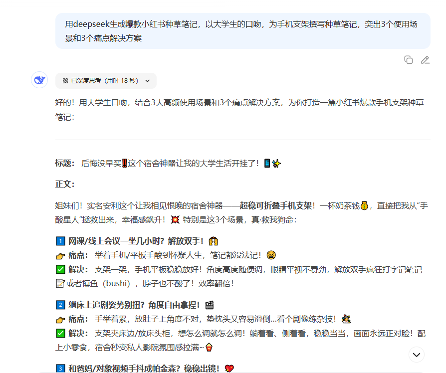 进入 DeepSeek 对话界面,输入类似以下指令:用 deepseek 生成爆款小红书种草笔记,以大学生的口吻,为手机支架撰写种草笔记,突出3个使用场景和3个痛点解决方案。