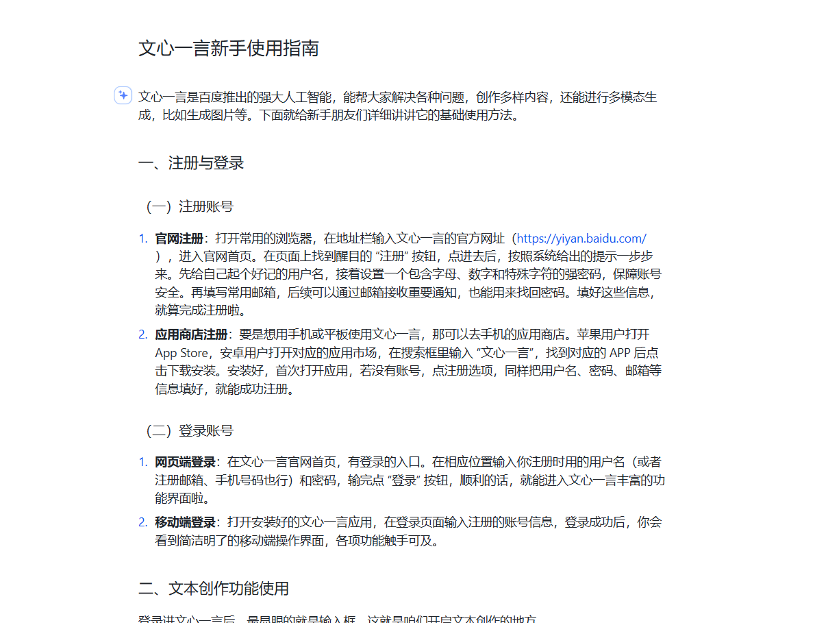 将豆包生成的内容进行梳理,按照逻辑顺序排版,形成完整的 AI 使用指南。例如把文心一言指南整理为 “注册与登录”“文本创作”“多模态生成”“常见问题” 几个部分,可打印出来供新手参考,或分享到团队群中用于培训,用整理后的指南生成实际可用的工具使用手册。