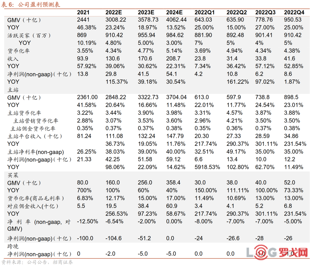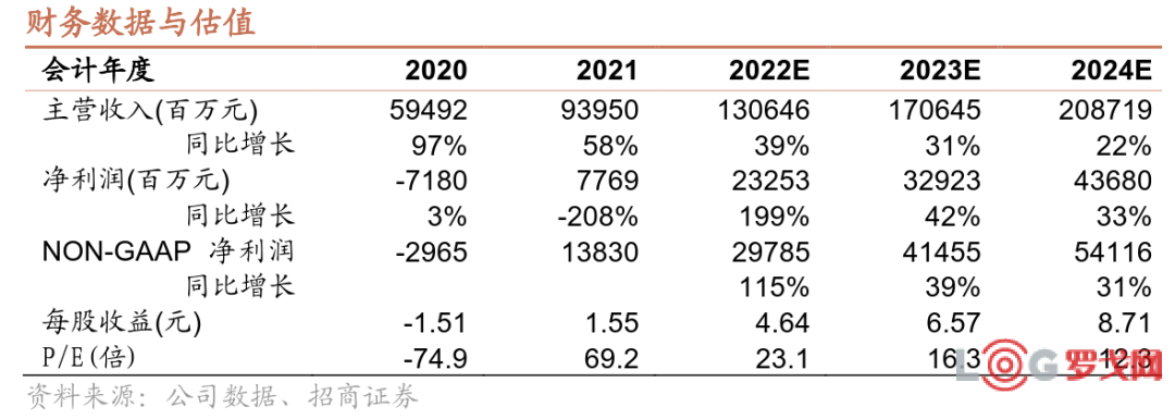 整体来看,我们认为国内供应链效率相比海外具备明显比较优势,同时北美高性价比电商平台相对缺失,为Temu提供了长期发展可能,拼多多依托丰富的电商运营经验与强大的组织执行能力有望在海外复制国内成功,为公司增长提供新的增长动力。同时,目前Temu未涉足资本开支较重的仓储物流环节,据前文测算亏损相对可控,不会对公司利润表产生明显影响。考虑到跨境项目亏损,我们调整公司2022-2024年NON-GAAP归母净利润为297.9亿元/414.6亿元/541.2亿元,同比增速分别为115.4%/39.2%/30.5%,给予公司2023年20倍PE,对应目标价91.2元,维持“强烈推荐”评级。