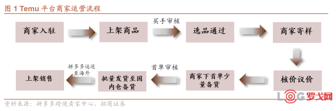 运营流程:1)商家入驻:Temu降低开店门槛,允许企业或个人入驻开店,符合要求的商家提交申请后等待平台对店铺进行审核;此前在拼多多开过店的商家可以一键入驻。2)选品:审核通过的商家可在后台上线商品,此后由买手进行线上选品,商品被选中后商家需寄样供平台线下审核。3)核价议价:样品质检通过后,平台将对商品进行核价,卖家需上报商品成本价和预期利润,最终定价权归属于平台,卖家拥有一次反馈议价的机会。4)商家送货:商家下首单并少量发货,平台审核首单通过后商家可批量发货到拼多多国内仓进行提前备货。5)上架销售:平台生成购物订单后,商品将由广州仓统一发往海外,此后的履约配送、售后服务等环节均有平台负责。