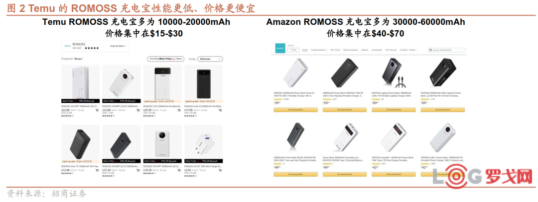 差异化选品策略:一方面,Temu在供应商招募及选品环节以同类平台中最低价为核心标准,严格控价。据调研,以1688.com同款商品为例,Temu要求供应商零售报价需低于1688.com 100-500件批发价。另一方面,Temu在产品选择上更偏向性能简单但价格更便宜的高性价比款式。以Romoss充电宝为例,亚马逊的Romoss充电宝前排展示区多为30000-60000mAh,价格集中在$40-$70,而Temu上架的款式多为10000-20000mAh基础款,性能稍弱,价格集中在$15-$30,比价优势明显,能够吸引更多对价格敏感、对于性能相对不敏感的中低端用户。