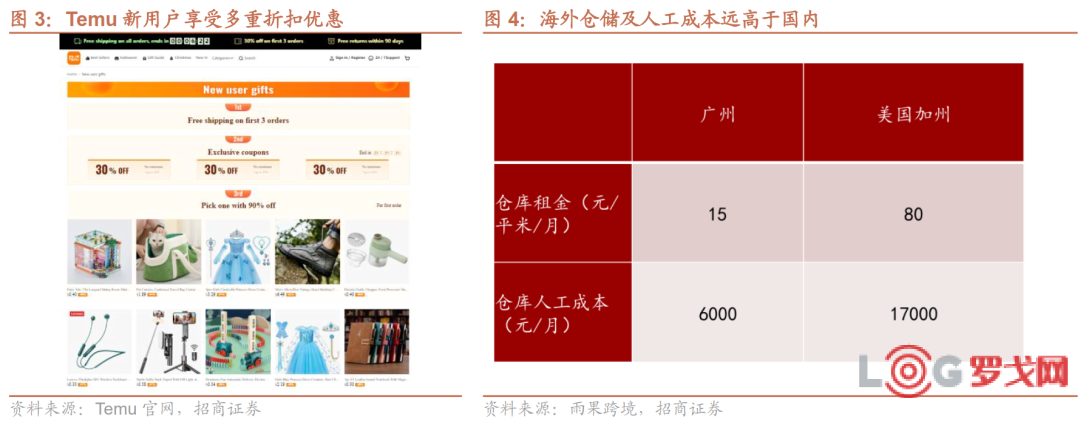 2)仓储成本:目前Temu国内大仓面积3万平方米,仓库租金约15元/平米/月,可得年度仓储成本540万人民币。