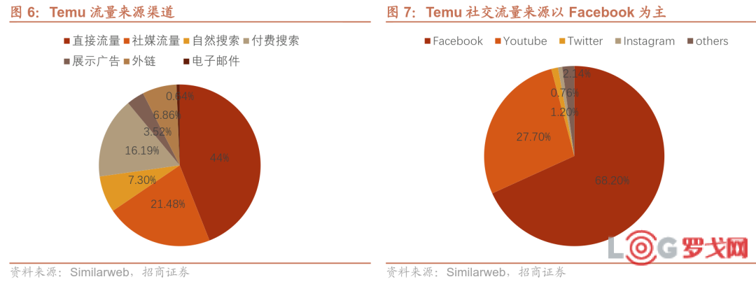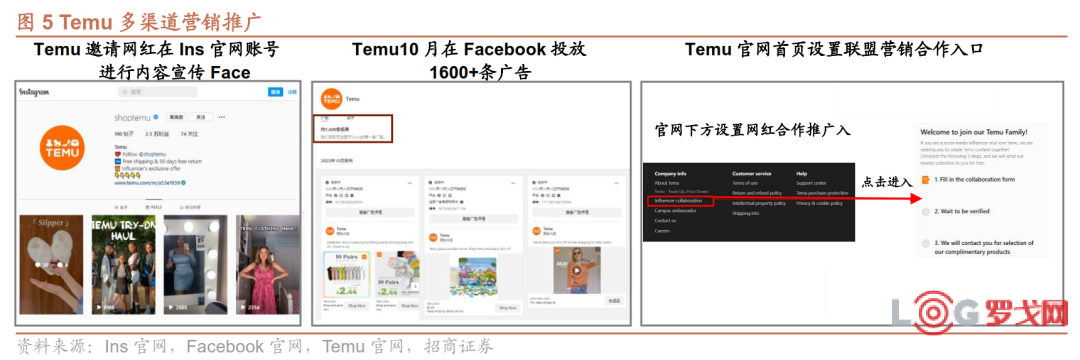 Temu通过社交、内容等多渠道营销推广,与友商较为相似。Temu冷启动阶段主要通过Facebook、谷歌、Ins、Tiktok、Twitter等平台内容型引流的方式获客,例如产品场景展示、头部网红开箱测评等,并在多个平台投放广告,10月在Facebook发布广告1600+条。此外Temu还通过联盟营销等方式获客,在官网首页设立Influencer collaboration入口,邀请有意向的博主、网红等联盟客多渠道协助推广,并给予返利佣金。对于拼多多主站流行的拼团模式,由于美国用户更注重个人隐私,预计效果一般。截至目前,据Similarweb,Temu直接流量占比约44%,社交媒体流量21.5%(以Facebook和Youtube为主),自然搜索占比7.3%,付费搜索占比16.2%,展示广告流量占比3.5%。