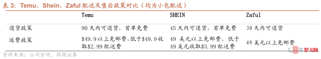 物流配送模式上,Temu支持邮政小包和商业快递两种配送模式。小包配送模式下,用户购买产品客单价高于$49.9时可享受包邮服务,低于$49.9需支付$2.99邮费,包裹7-15个工作日可送达;商业快递模式的履约时效更高,包邮价格为$99.9,低于包邮价需收取$12.99配送费,此外平台不定期开展全场商品免邮费、包邮区间价格下调等优惠活动。售后退换货环节,Temu采用90天内可退换货、首单退货免费的政策,相比SHEIN进一步拓宽退货时限。