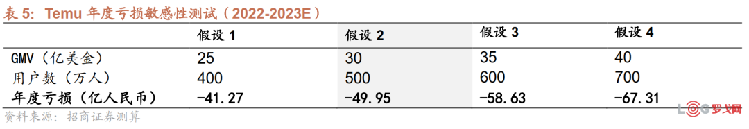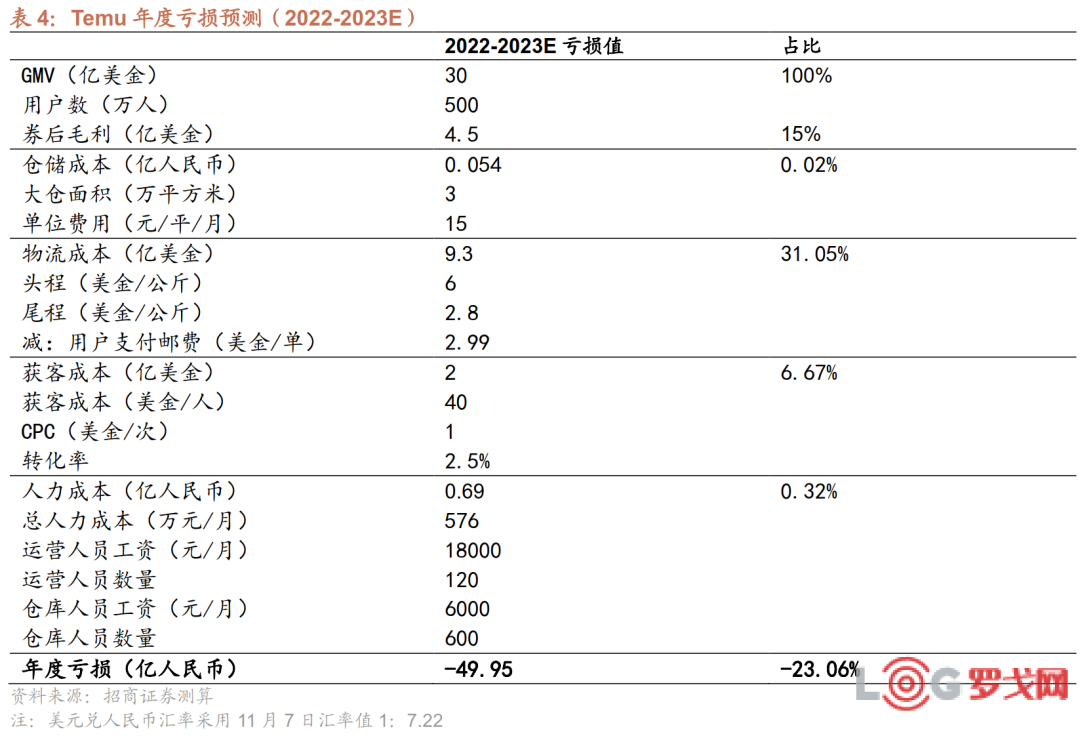 亏损预判:预计第一年亏损额50亿人民币左右。我们以Temu第一年为例(2022.9.1-2023.9.1)对其年度亏损进行预判。假设第一年可实现GMV 30亿美金,用户数达500万。以下为针对成本拆分假设的解释说明: