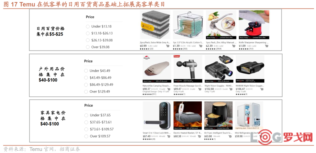 Temu以极致性价比吸引消费者。Temu延续拼多多国内主站定位,主打性价比,致力于打造电商平台中的绝对比价优势。分品类来看,Temu以女装类目切入的原因之一是以在美国市场具有较高知名度的快时尚女装跨境电商平台SHEIN为锚点,进而凸显自身价格优势。我们将Temu、Shein、Zaful平台内同类产品价格进行对比,可以发现Temu价格相比SHEIN普遍低30%-50%,比Zaful低一倍以上。此外对于日用百货商品,Temu价格多集中在1-5美元,通常是亚马逊同类产品价格的1/3~2/3,此外对于一些国内制造端优势明显、目标客群以高收入用户为主的小众运动用品(如冰球防滑胶带、潜水装置等),Temu同类产品价格可达亚马逊的1/5左右。