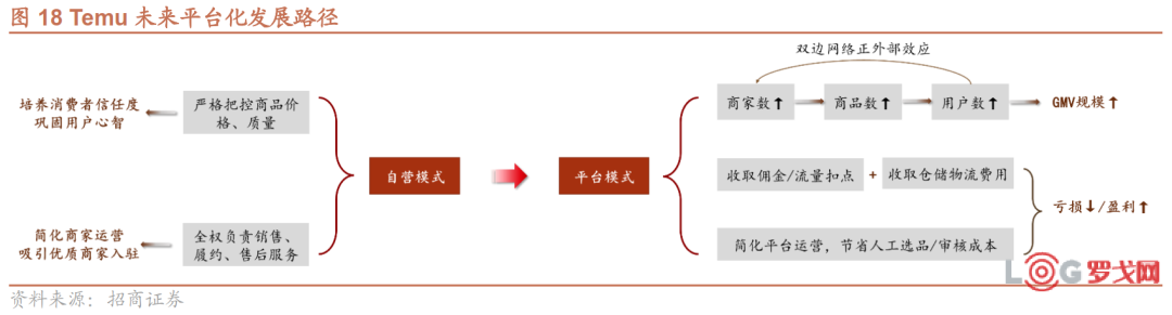 平台化:长期来看,当销售体量达到一定规模、流量相对稳定后,为实现体量的进一步扩张,Temu未来或将趋向于平台化的发展模式。从销售规模来看,平台化将大幅提升商家及商品供给,进一步扩大双边网络正外部效应,推动GMV加速扩张;从盈利路径来看,一方面平台可向商家收取流量及佣金扣点,以及要求入驻商家逐步承担部分物流及仓储成本,从而提高平台收入,另一方面平台也将逐渐简化人工选品、人工审核等环节,降低运营成本,推动Temu加速实现盈利。