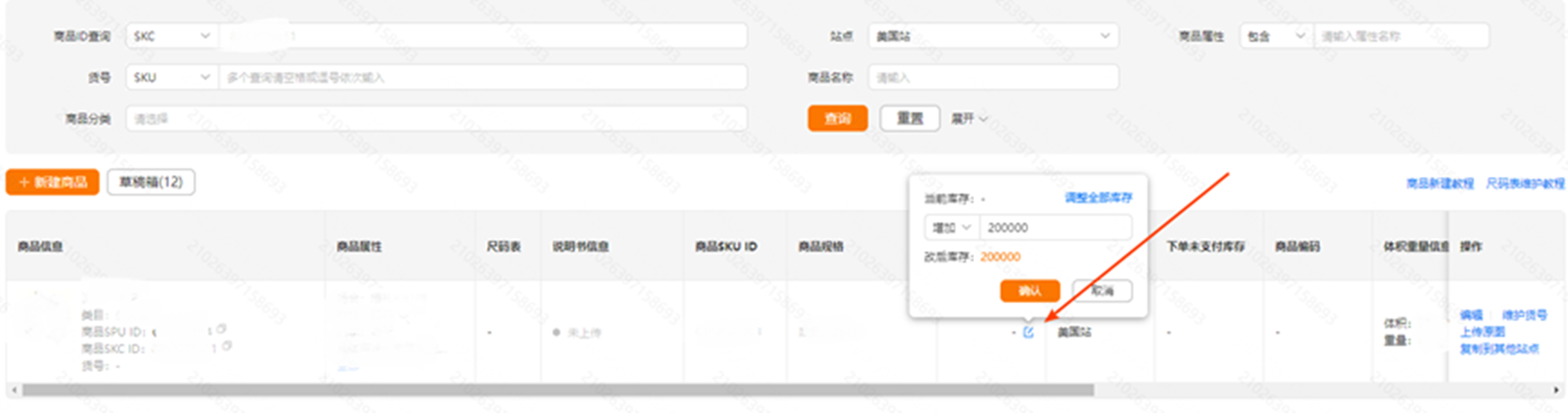 (2)库存数限制:库存数*sku申报价格≤100000,可以批量增加、减少单spu下的所有sku库存数;
