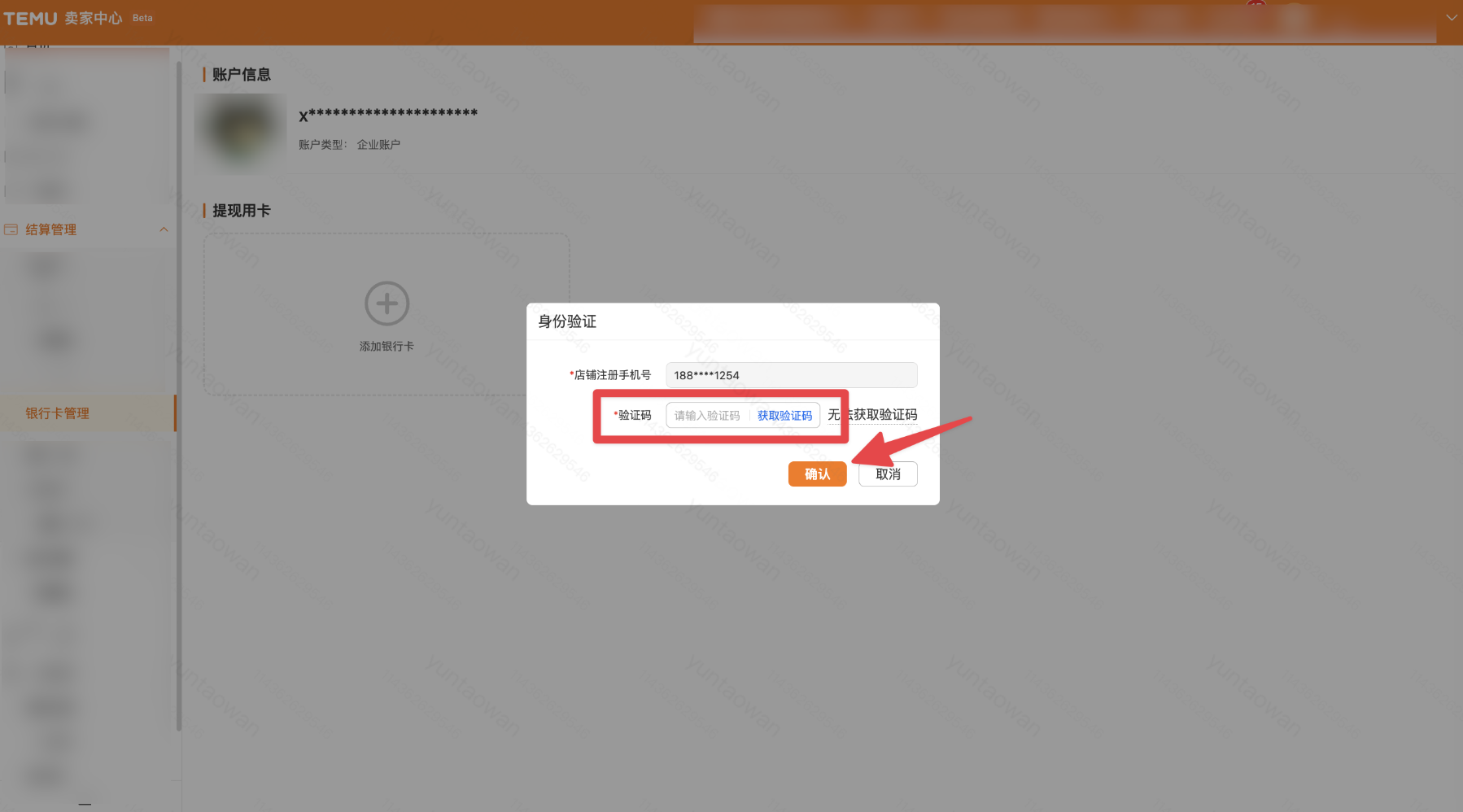 在您点击「添加银行卡」后,页面上会弹出身份验证的弹窗,请您先点击获取验证码,收到手机短信验证码后在输入框内输入,点击「确认」完成身份验证。