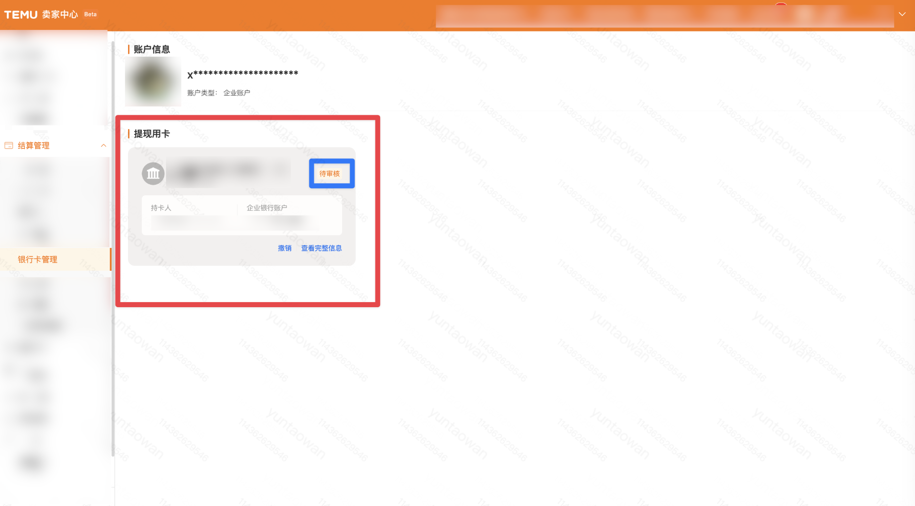 提交审核后,您在银行卡管理页面看到的银行卡的状态显示为「待审核」。此时需要等待银行卡信息审核,一般在7日内完成审核。