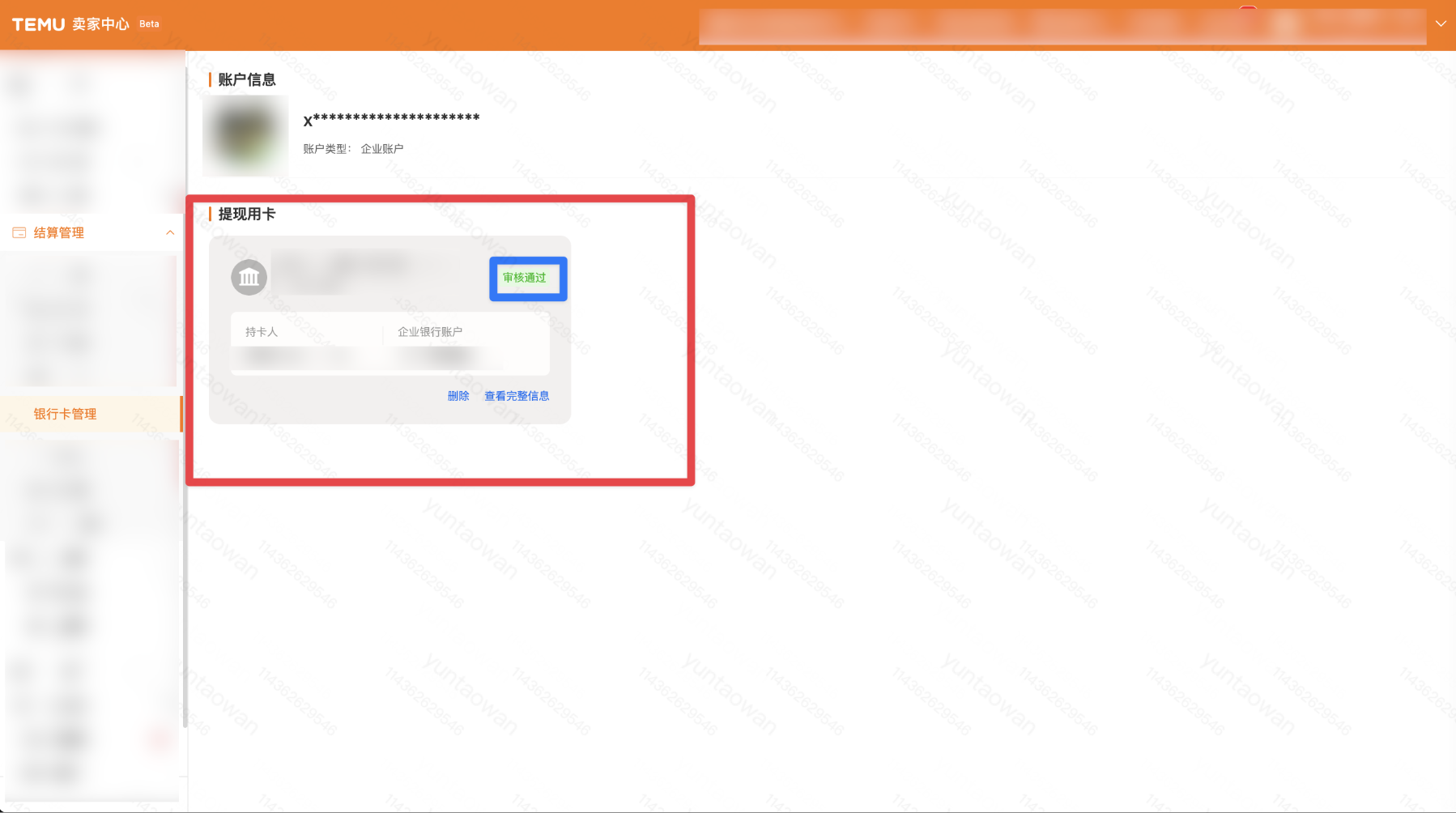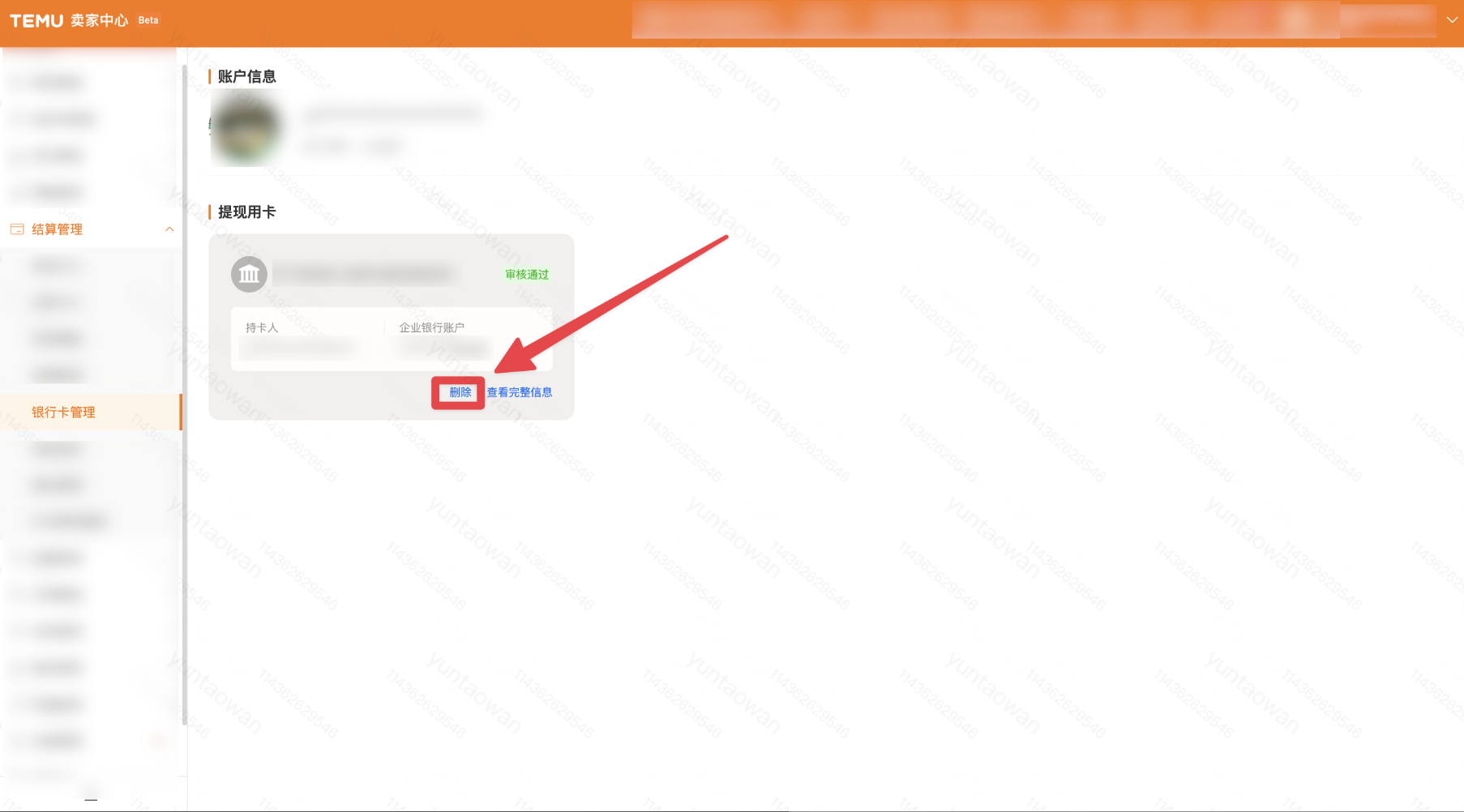 在登陆TEMU卖家中心之后,您需要进入【结算管理-银行卡管理】页面,此时您可在在页面上看到当前绑定的银行卡,点击下方的「删除」按钮就可以发起删卡操作了。