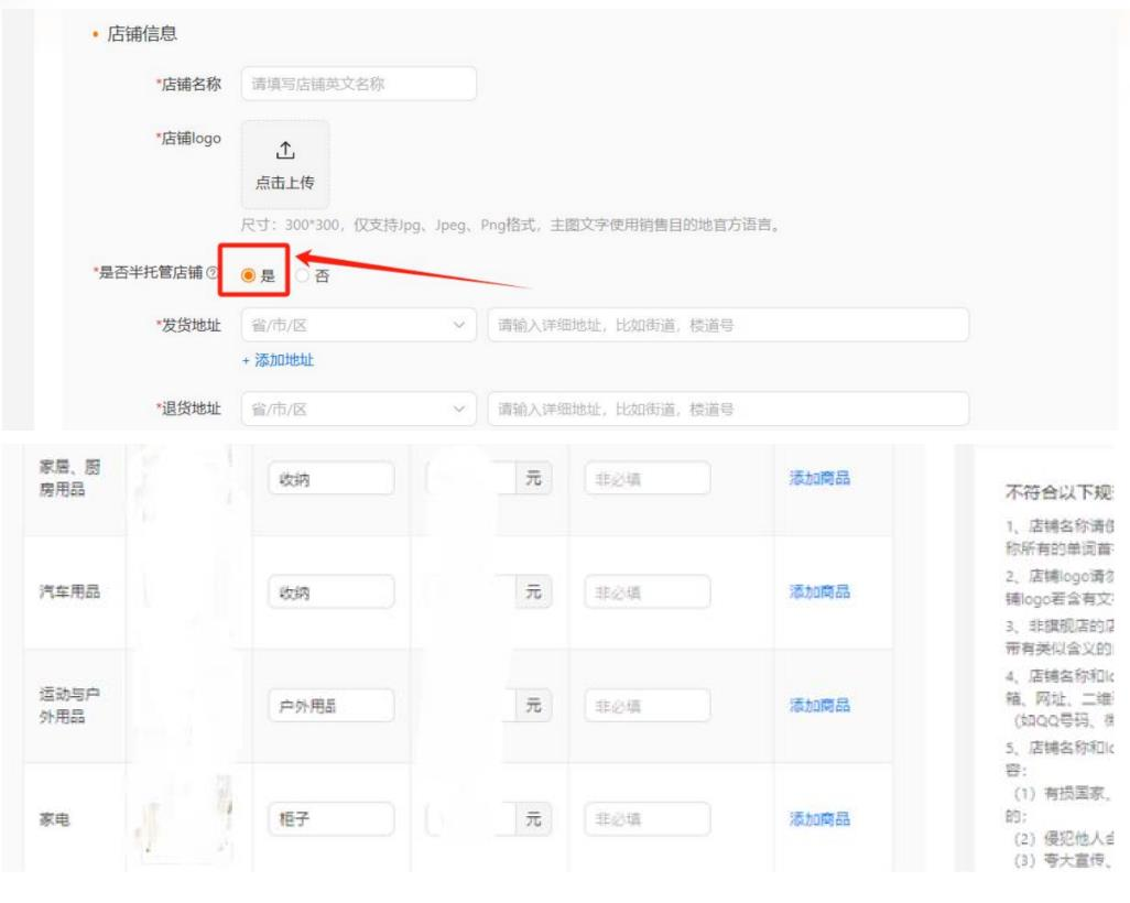 6、选择半托管: 在是否半托管店铺选项中选择“是”。