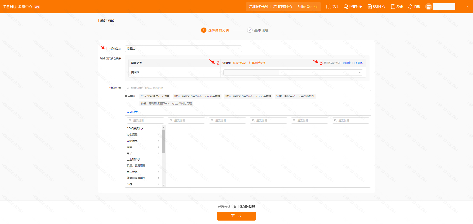 首先您需选择商品希望售卖的站点,在选择站点时您需确保商品满足对应站点的销售要求,例如: