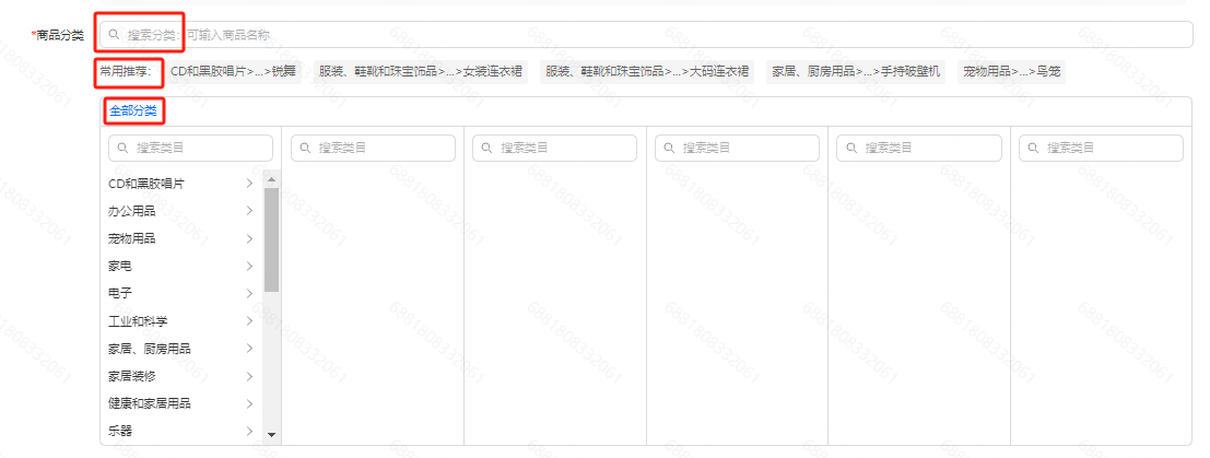 可通过【商品分类】搜索框进行搜索,并在下拉列表中选择相关类目,即会自动填充到【全部类目】选择框中。例如:输入短袖,即可搜索出来:短袖、女士短袖、男士短袖等相关类目