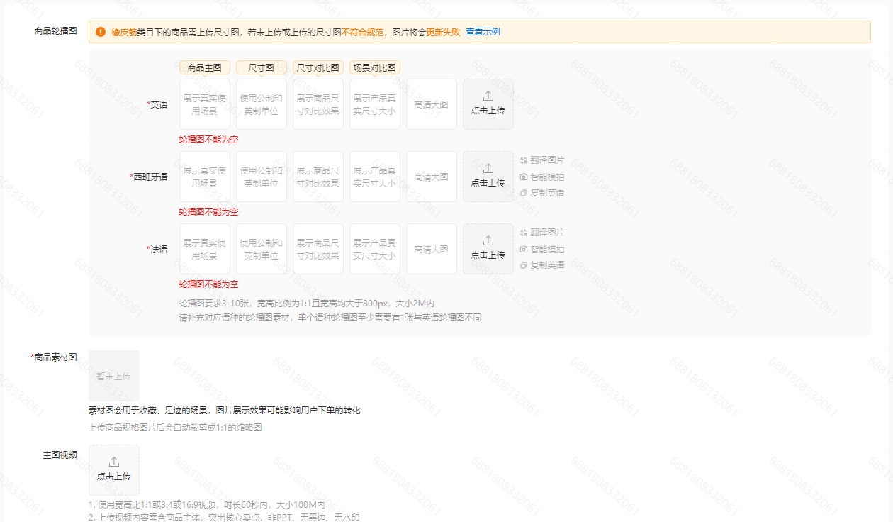 勾选多语言素材上传后,需要上传不同语言素材的轮播图,详情见下方商品轮播图