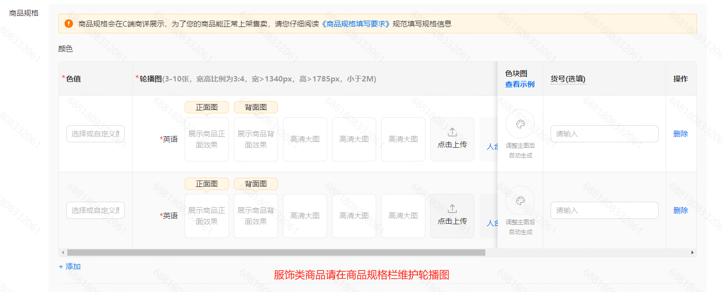 请根据不同类目轮播图要求上传图片(例如,橡皮筋类目需要上传尺寸图);服饰类商品轮播图需要对不同色值分别进行维护,请在【商品规格】栏对其进行维护