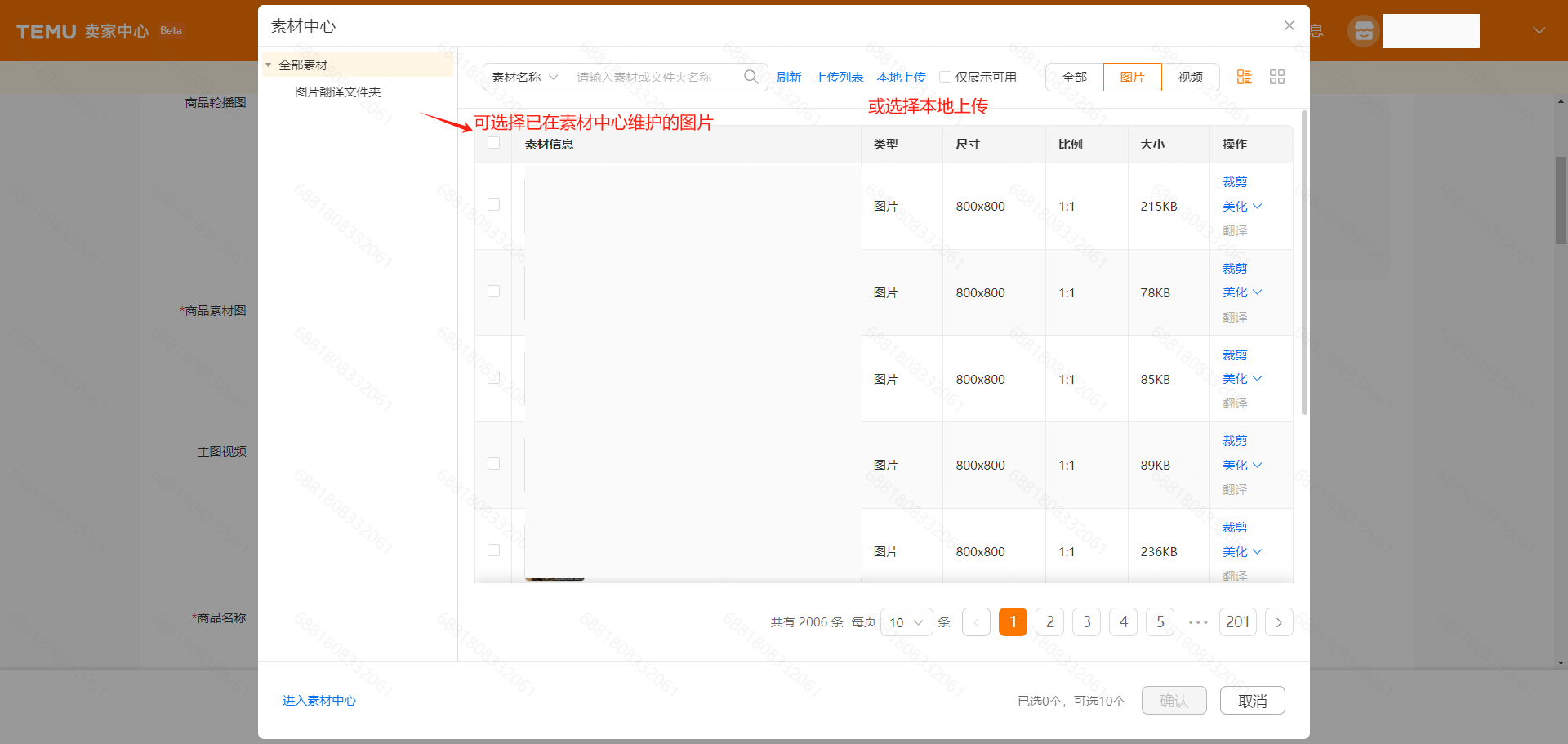 点击上传图片后,您可以选择本地上传或从素材中心选取图片(可考虑在素材中心批量维护,以提高效率)