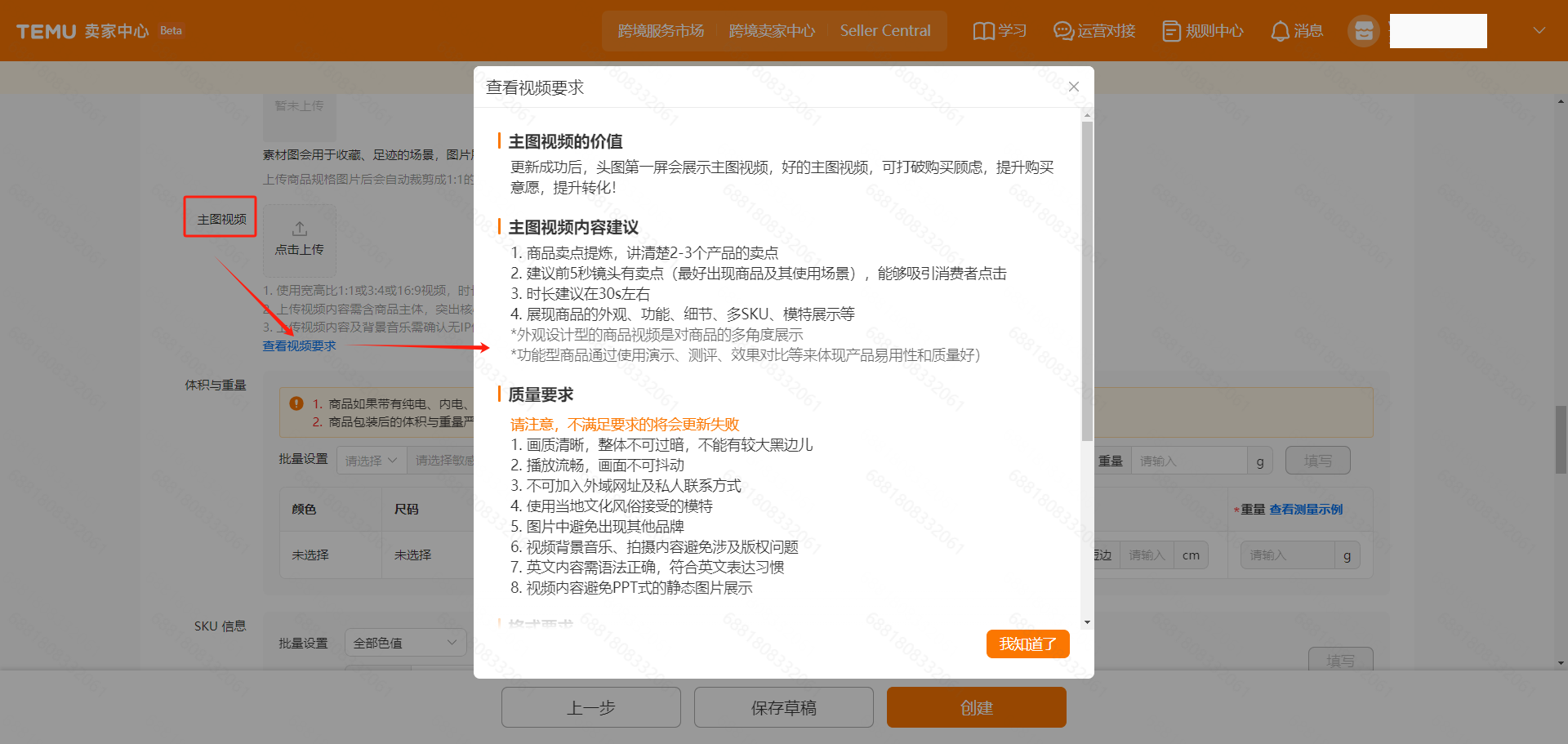 上传视频前,点击查看视频要求,根据主图视频内容建议、质量要求、格式要求上传视频