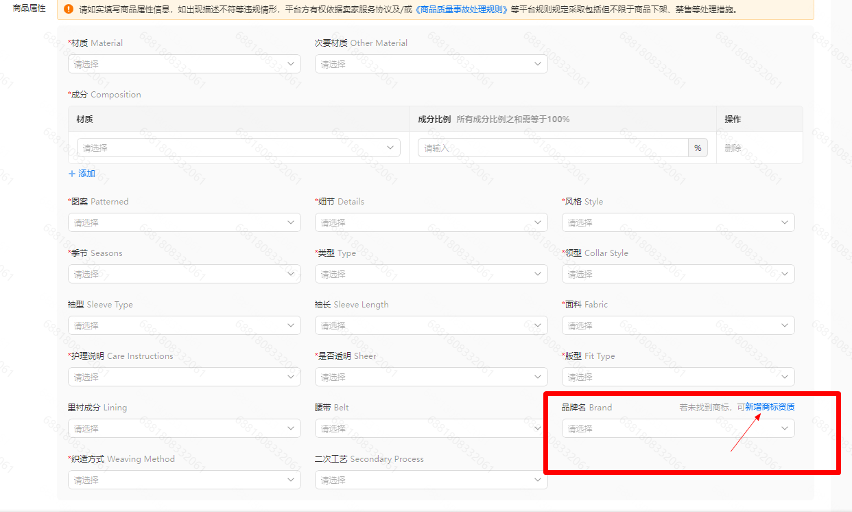 如需填写品牌信息,您可以选择主体维护的商标资质,还未创建商标资质的,可以点击新增商标资质,新增授权商标或自有商标(或通过首页——账户管理——主体详情——商标资质——新增资质)