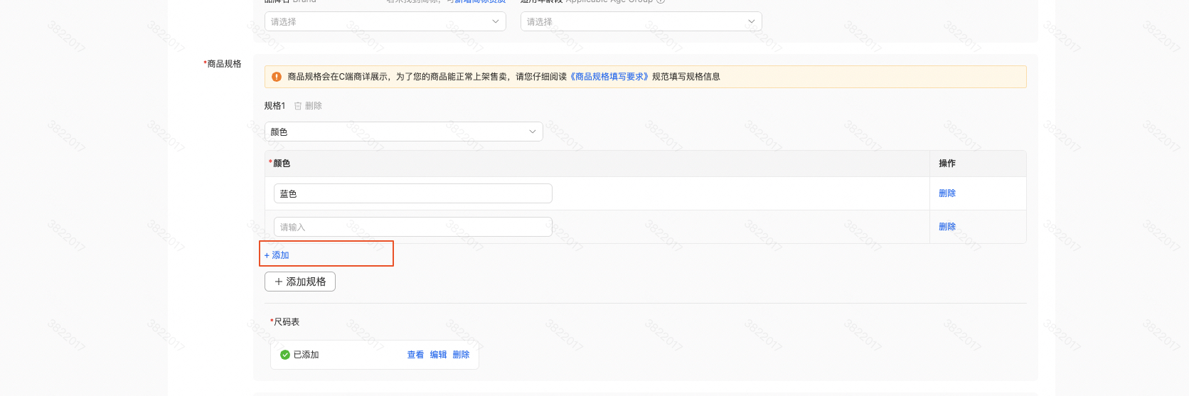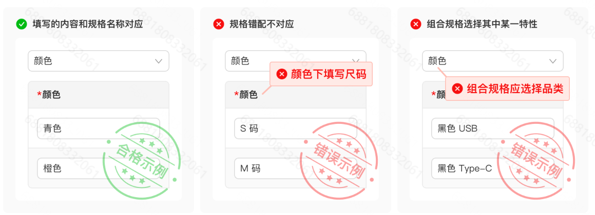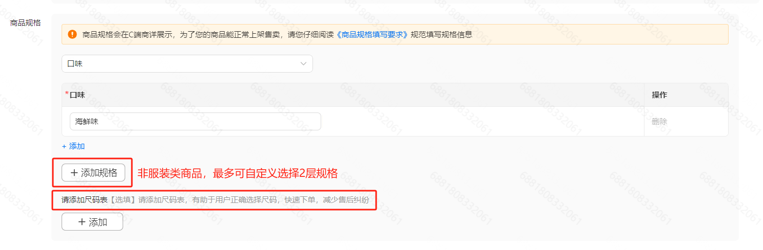 商品规格会在C端商详展示,为了您的商品能正常上架售卖,请按照规范填写规格信息