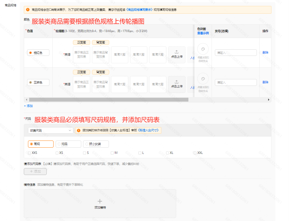服装类商品请确保选择正确的尺码类型后再填写尺码信息,切换尺码类型将清空原尺码、尺码表及模特信息