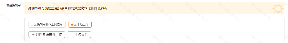 说明书尽可能覆盖更多语言将有效提高转化和降低客诉,如无多语言文件,可使用商品说明书翻译工具翻译后上传(翻译结果仅供参考)