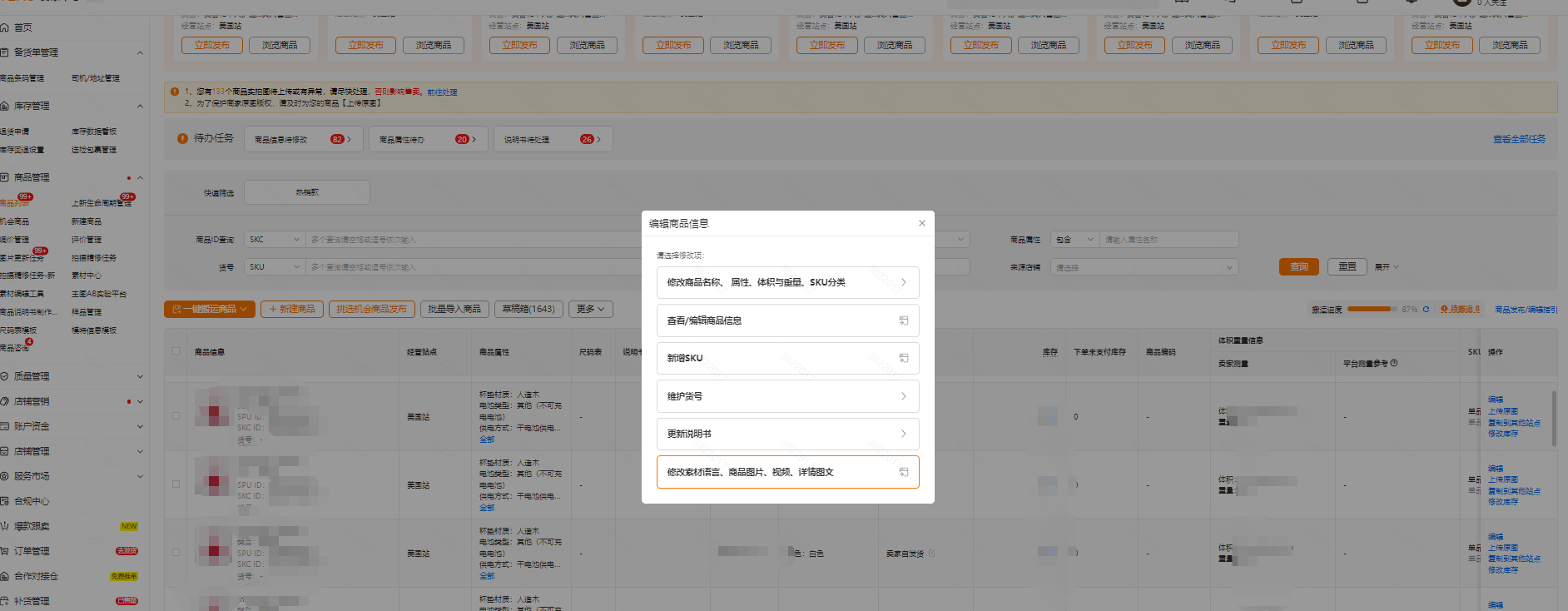 ②选择编辑项(不同上新流程的修改限制不同,请根据需求选择符合情况的可选项)
