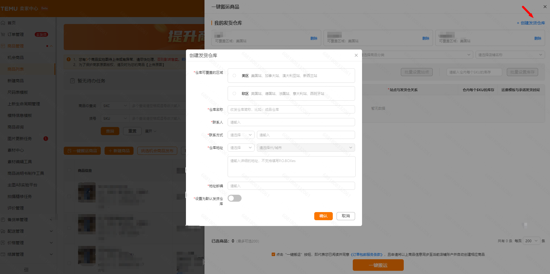 若无可选发货仓,需要先创建发货仓,可在卖家中心首页点击【配送管理】-【仓库地址管理】进行创建,请注意在跳转时,根据站点所属区域选择前往美区or欧区页面。