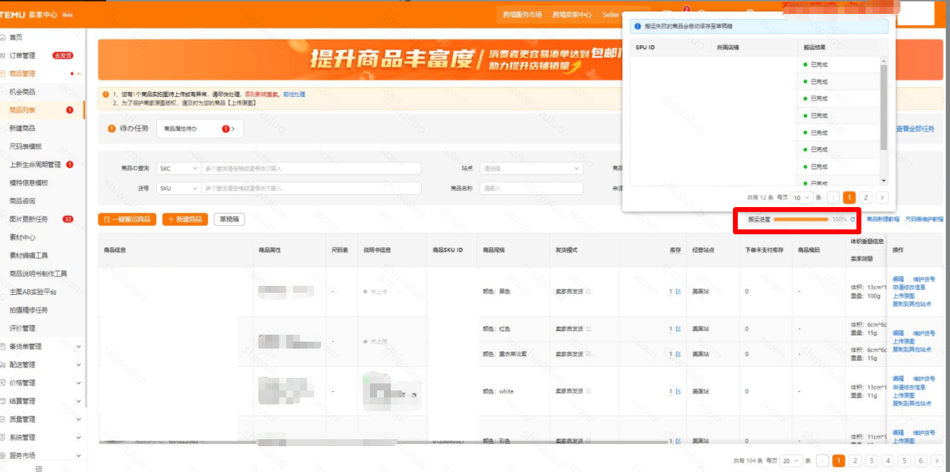 ⑤搬品后,可查看对应搬运进度,已完成的数据将自动创建相关商品,失败的流入草稿箱内修改信息后可重新创建