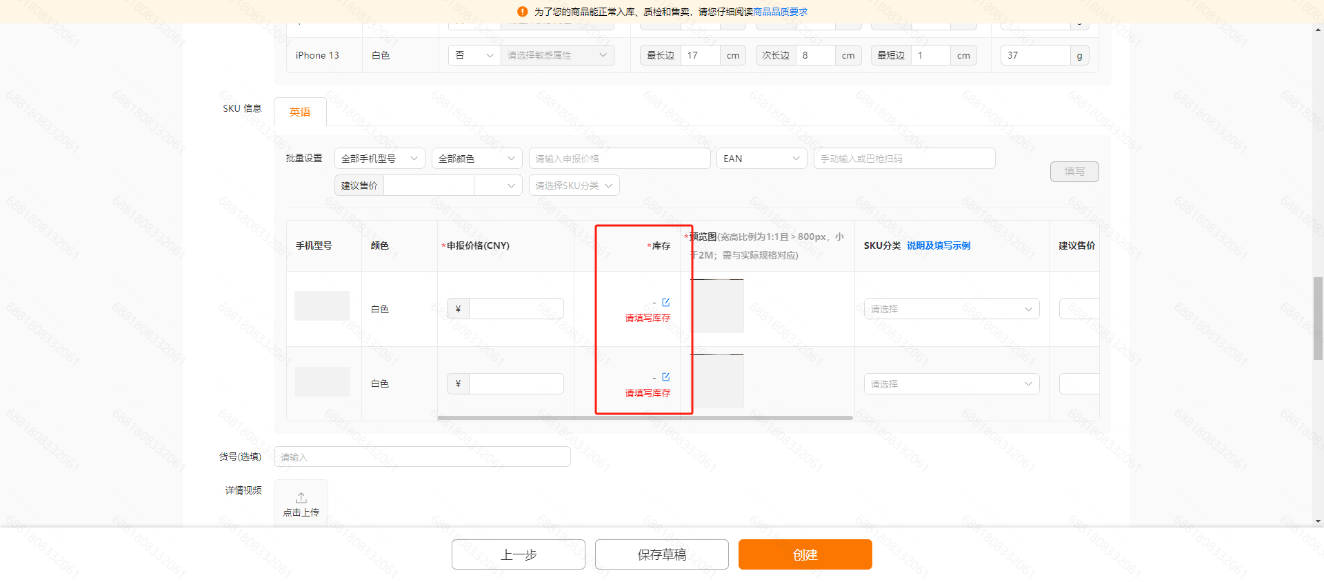 ④修改好商品信息,并填写好库存后,点击创建,即可新建商品