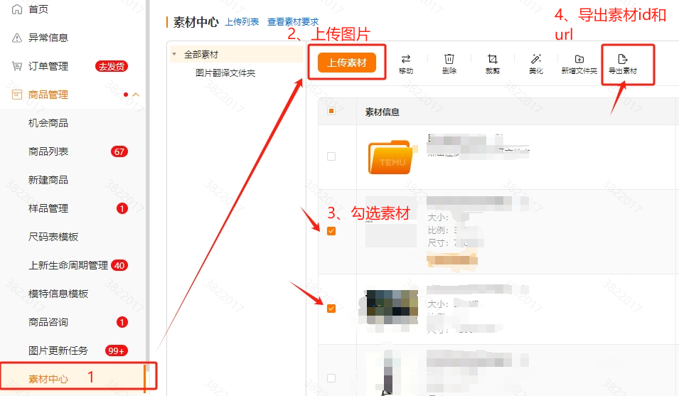 素材中心维护图片/视频后,支持批量导出素材名称、素材id和素材url