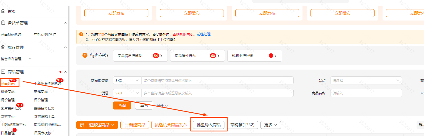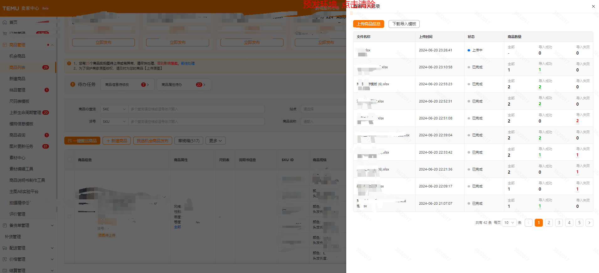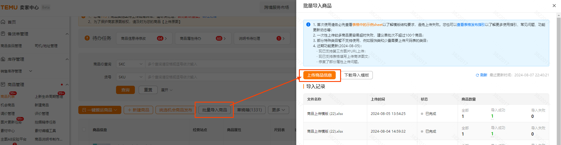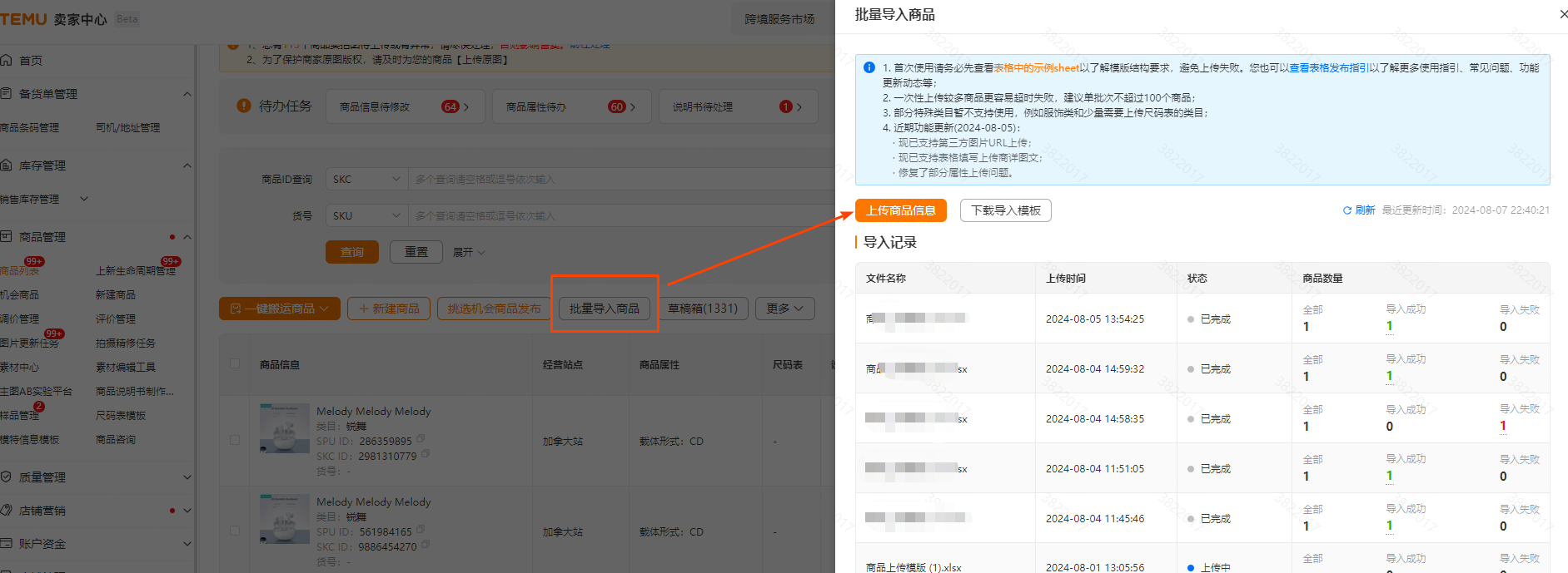 ⑥上传后可通过批量导入商品——查看导入记录,查看商品上传状态