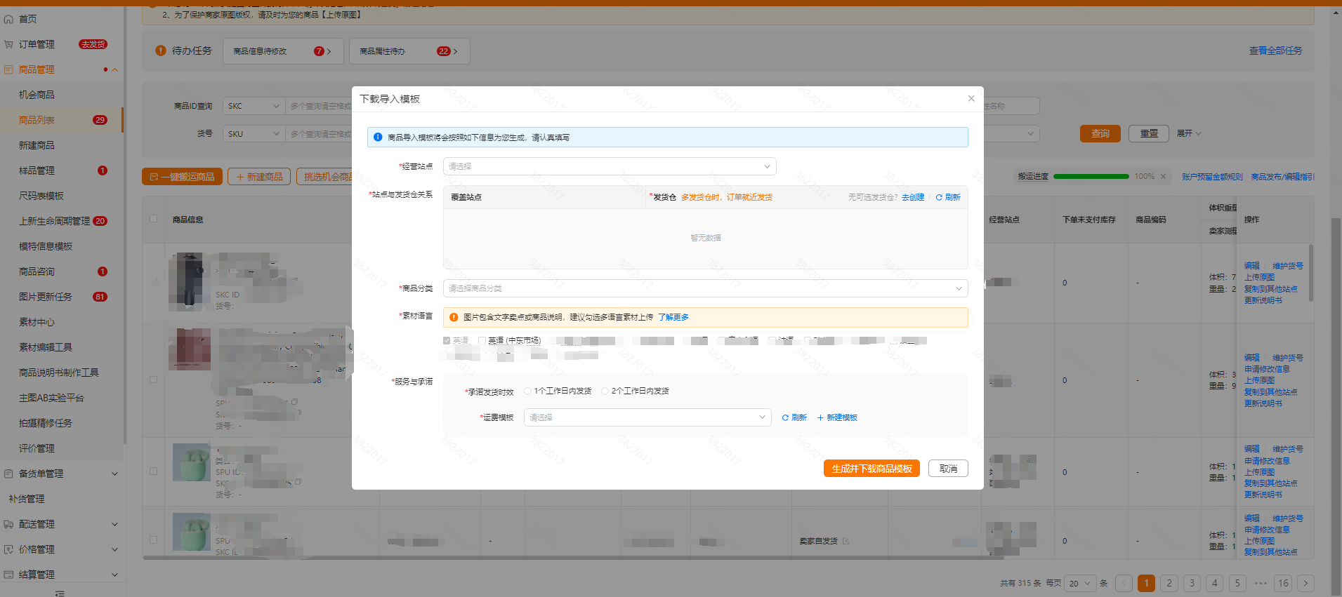 ②选择经营站点、经营站点的发货仓、商品类目、素材语言、运费模板以及发货承诺时效后,点击【生成并下载商品模板】,即可获取excel模板