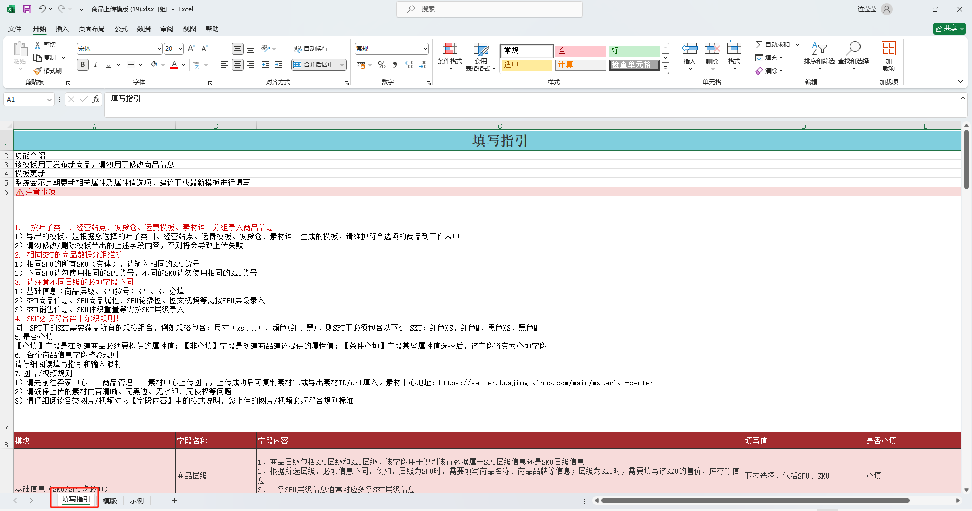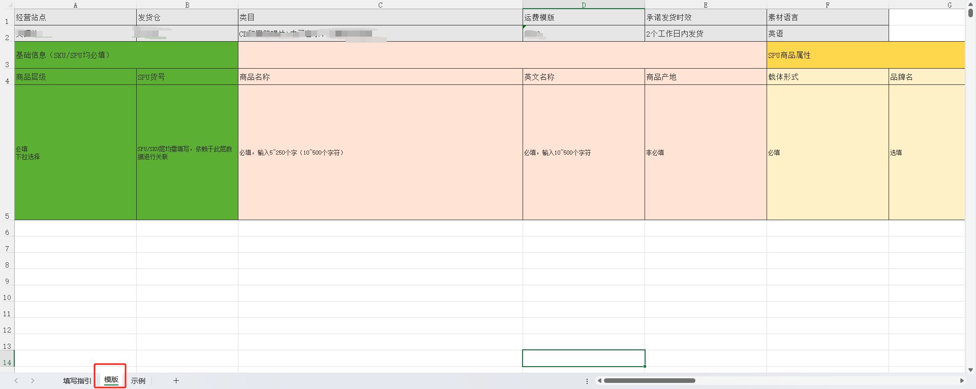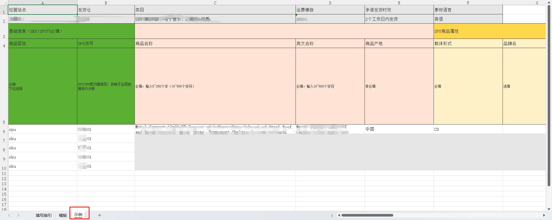 ③下载模板后,可查看【填写指引】和【示例】,并根据【填写指引】将商品信息填写到【模板】表中