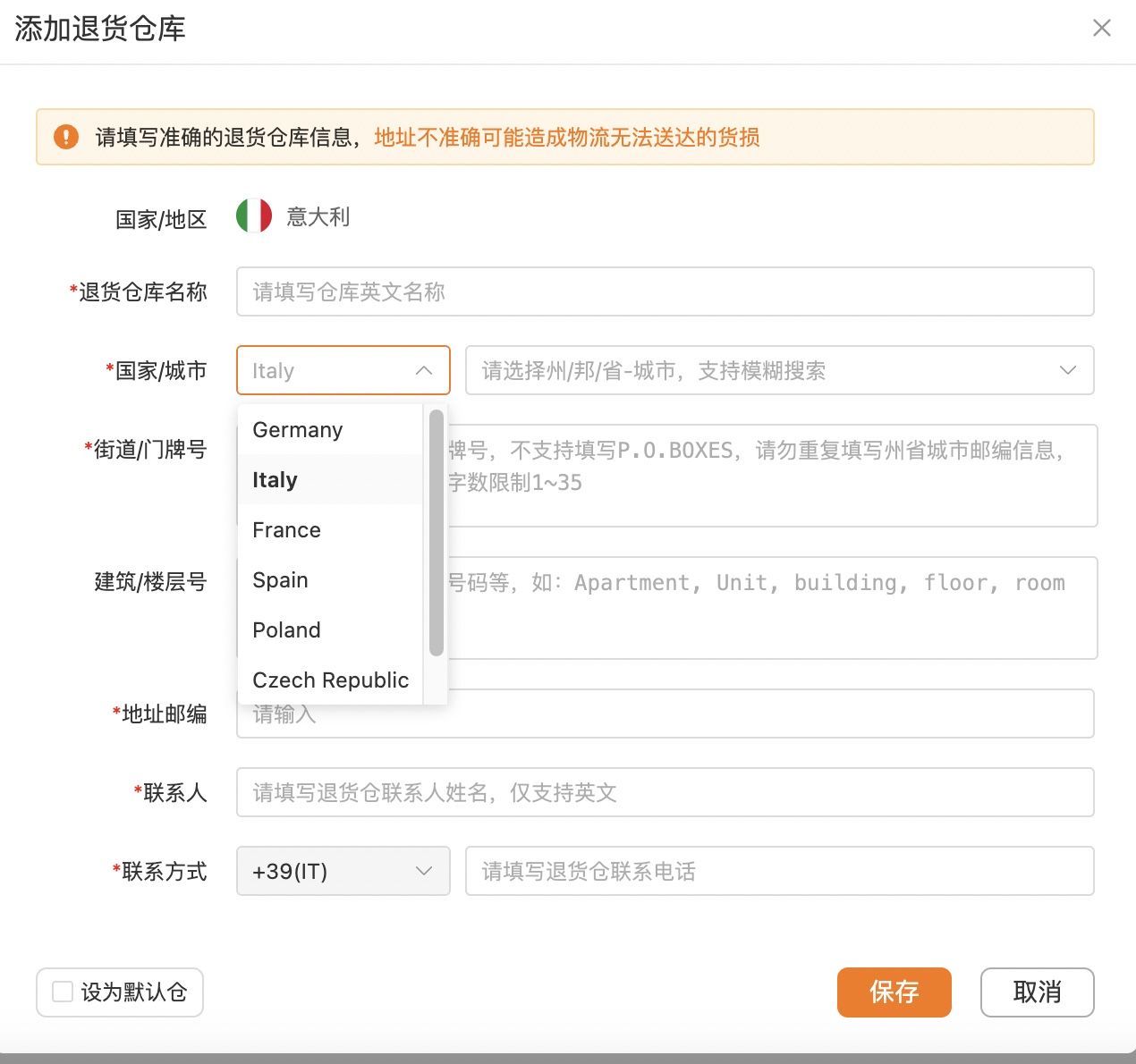 2.对于系统不支持自动代订退货标签、线上未放开退回本地退货仓的站点(如德国、意大利),需要联系对接招商运营开通功能,即可以选择退回本国或跨国商家仓,此时兜底退货渠道仅有由商家上传退货标签;