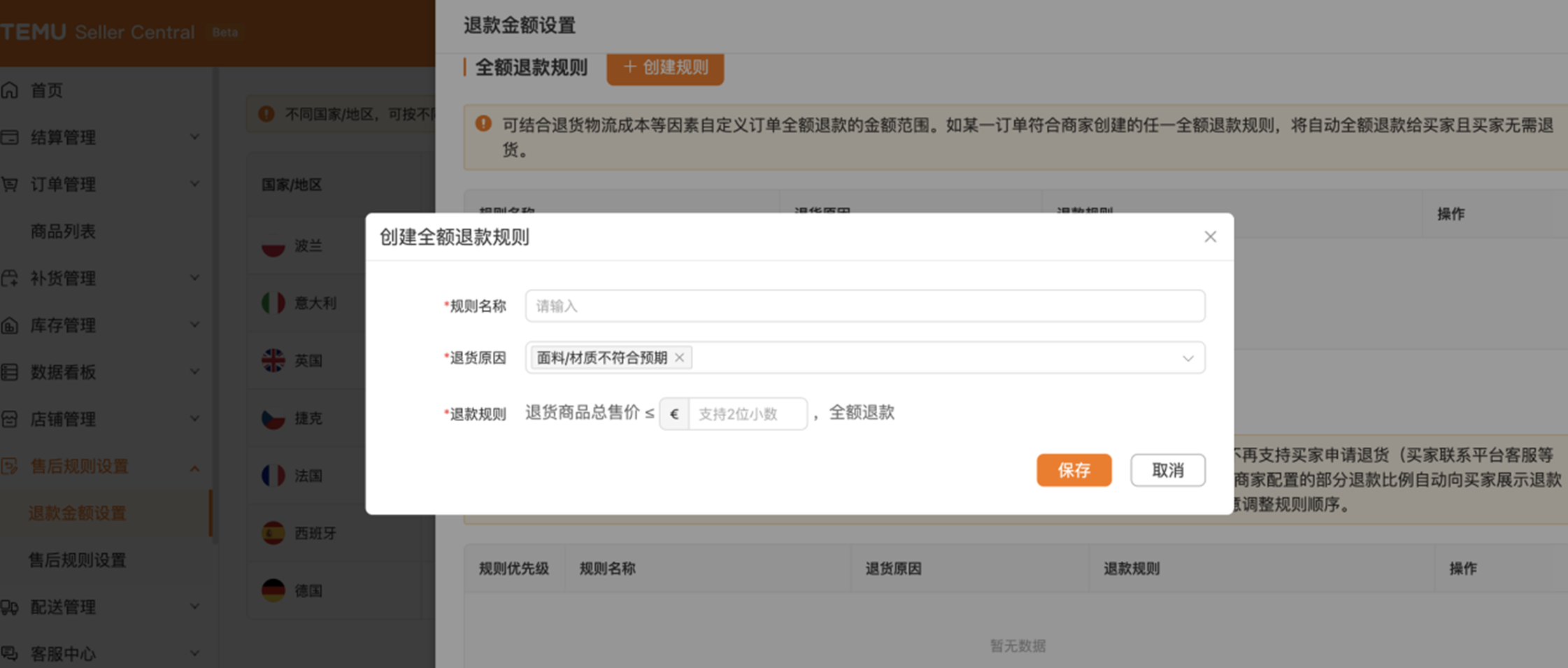 2.商家可以设置5%-100%之间的部分退款比例。设置后,当用户退货命中仅退款策略时,可部分退款,不用退货。