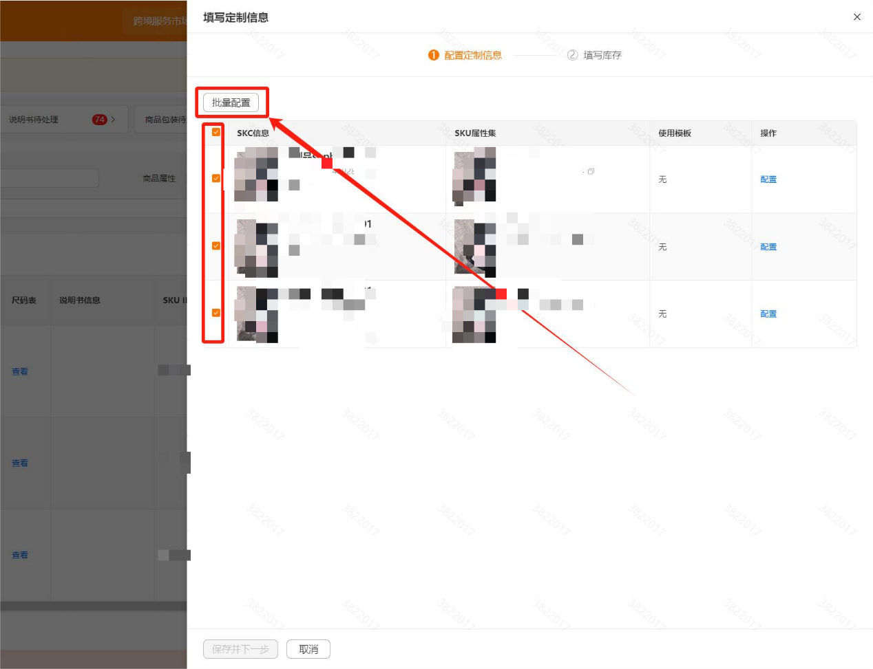 (1)签署完毕创建须知后,进入填写定制信息页面,定制信息模板为SKU维度,支持对定制信息模板进行批量配置,满足服饰等类目下存在大量SKU相同场景(比如服饰仅尺码不同等情形),也可单独点击操作栏【配置】,予以配置定制信息。