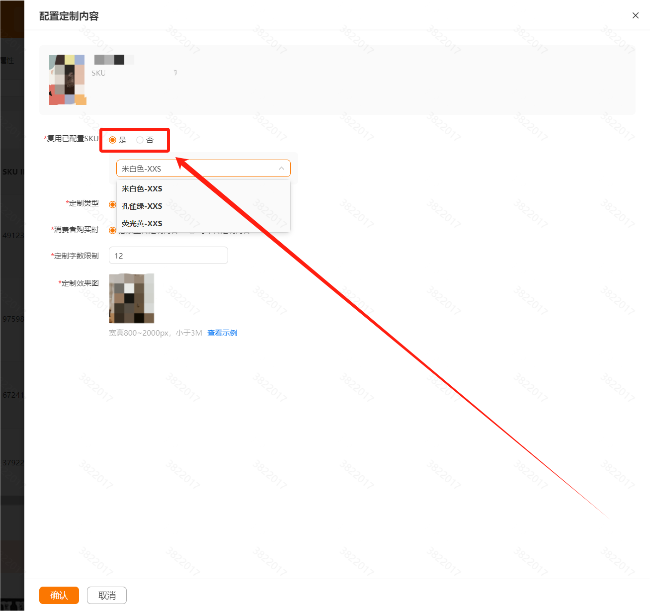 (2)商品维度下,部分SKU定制信息模版一致时,可以选择复用,快速填充。