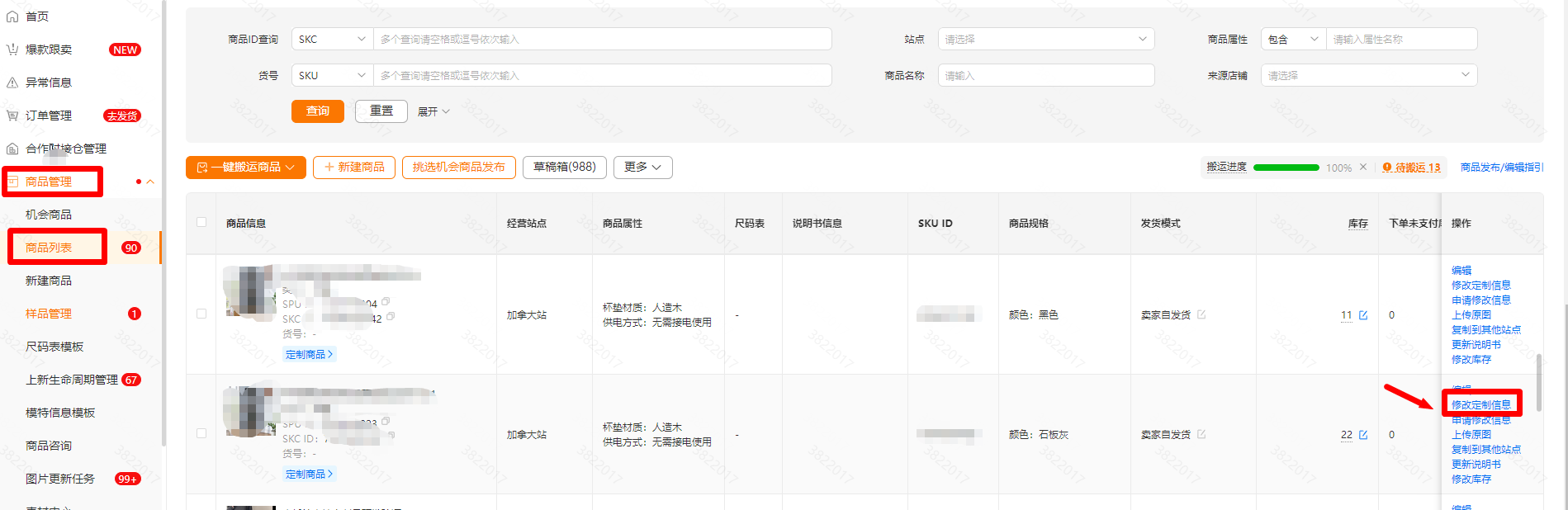 路径:商品管理-商品列表-操作栏【修改定制信息】