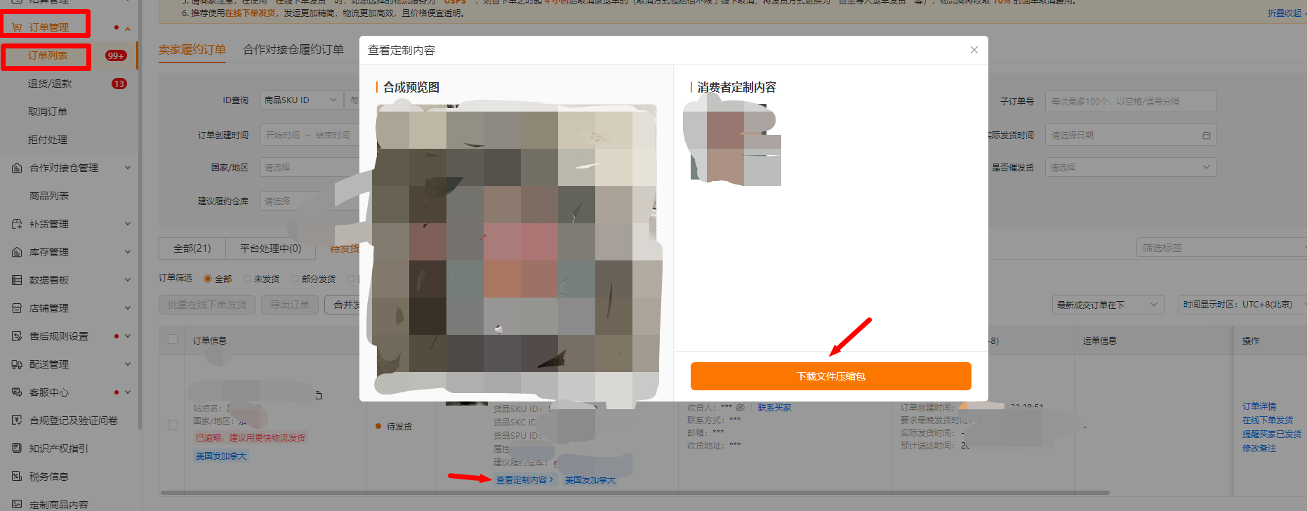 (2)可复制消费者上传的文字,或者下载单个定制品订单的文件压缩包(包含合成预览图、消费者上传原图、定制区域图)。
