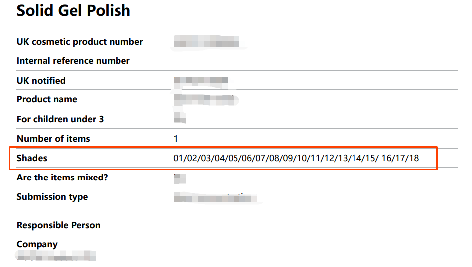 【问题】资质文件中Shades后面列举的色号是01/02/……17/18,实拍图色号是25/26/27/28/……,两者色号并不一致。