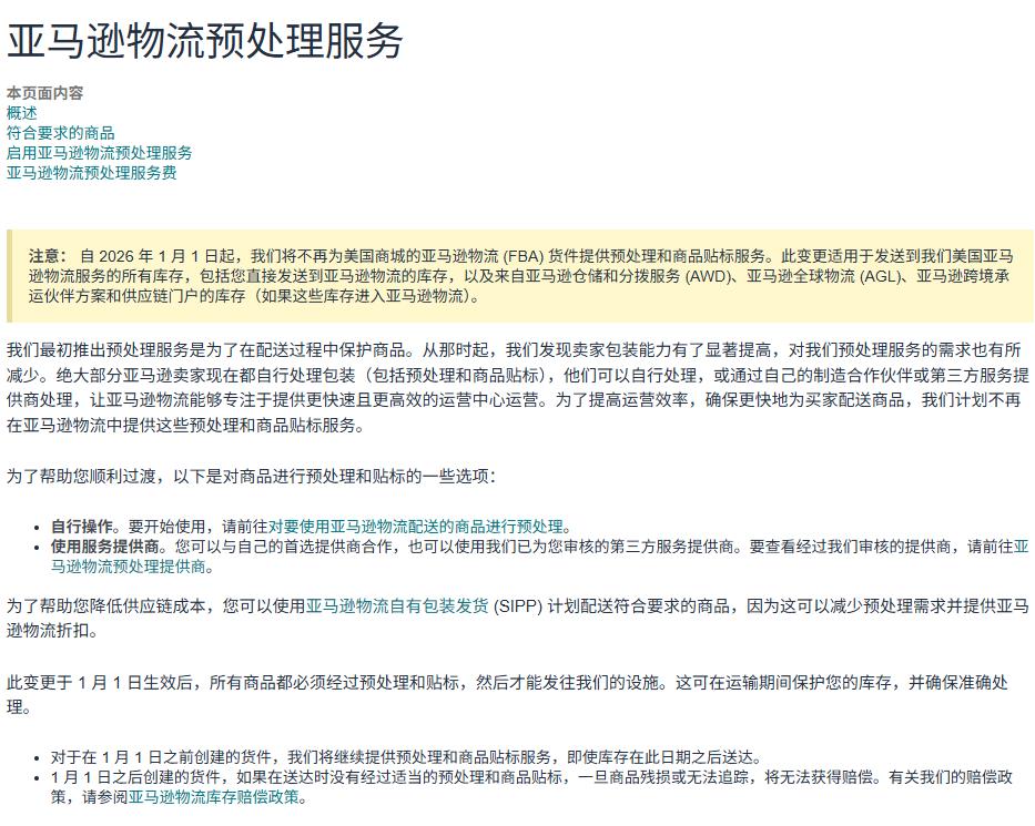 2025 年 7 月 29 日,亚马逊美国站发布了一则重磅通知,宣告从 2026 年 1 月 1 日起,将全面停止 FBA 提供的备货准备和商品标签服务!